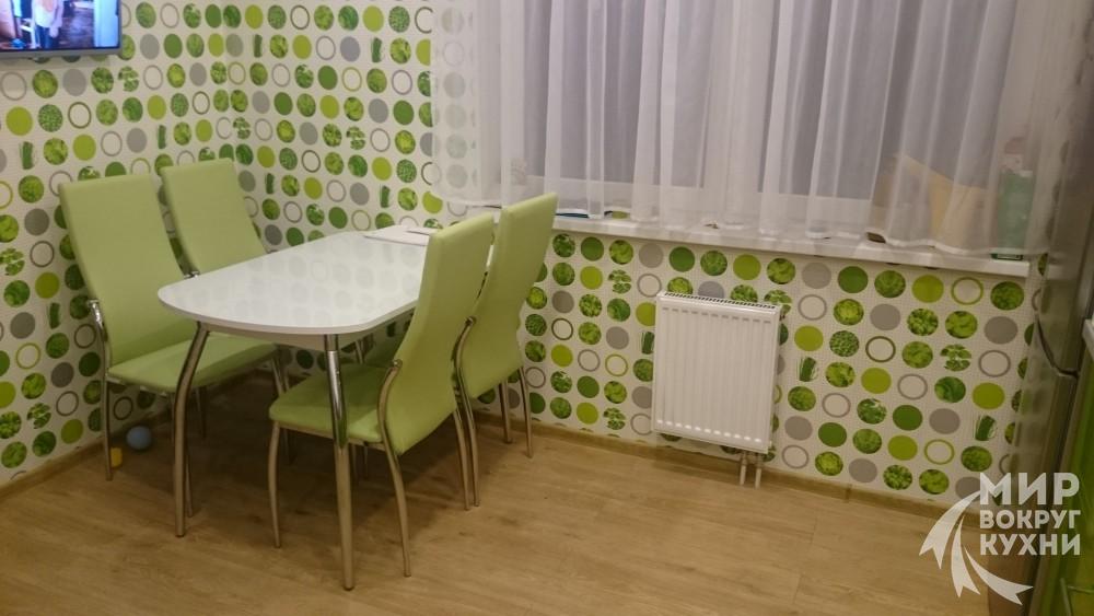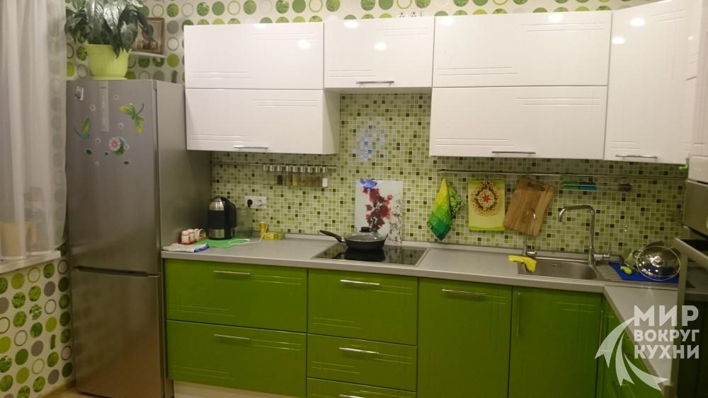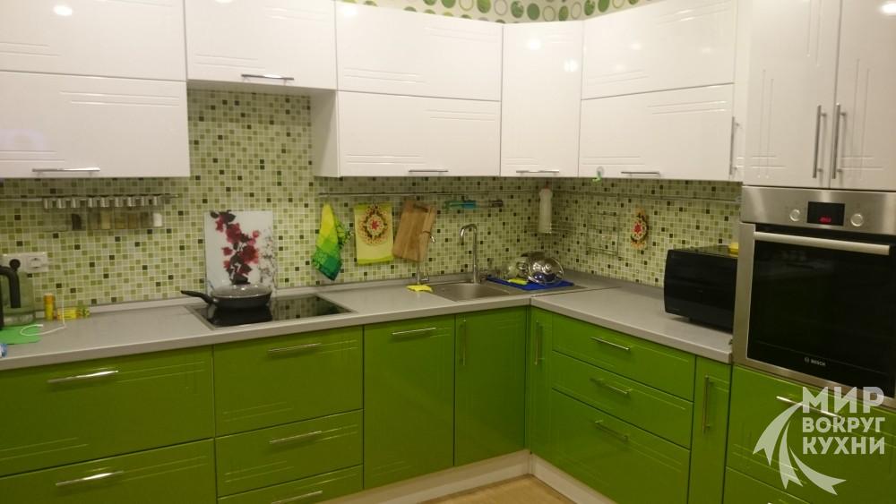 Цвет фасадов – навесные шкафы цвет Белый глянец,рабочие столы цвет Олива глянец
