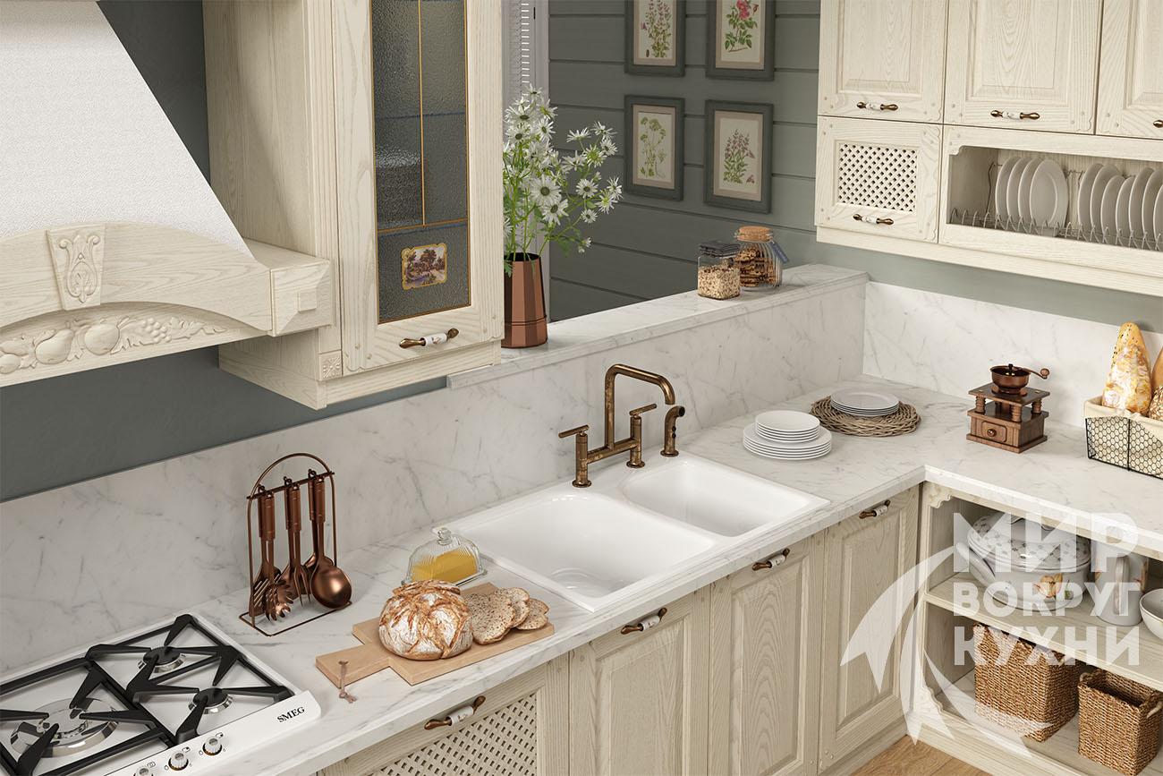 Столешница –из искуственного камня (не входит в общую стоимость гарнитура). Возможно установить столешницу 38 мм из пластиков США (Wilsonart), Россия (Arcobaleno), Германия (Duropal).Так же возможна установка Стеновой панели – МДФ 6 мм (покрытая пластиком производства Италия, США, Россия или Германия, фотопечать на стекле(скинали)-6 мм каленое стекло с нанесением фотопечати.